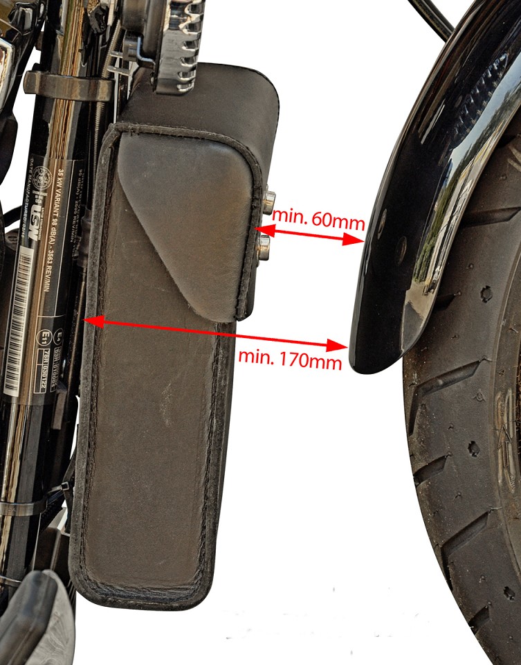 - Make sure that the bag has sufficient space to the front mudguard! When the front wheel is compressed, the mudguard can come dangerously close to the bag. When the front wheel is fully extended, there should be at least 60 mm of space between the bag and the mudguard. Without the bag, this is about 170 mm between the mudguard and the frame tube.